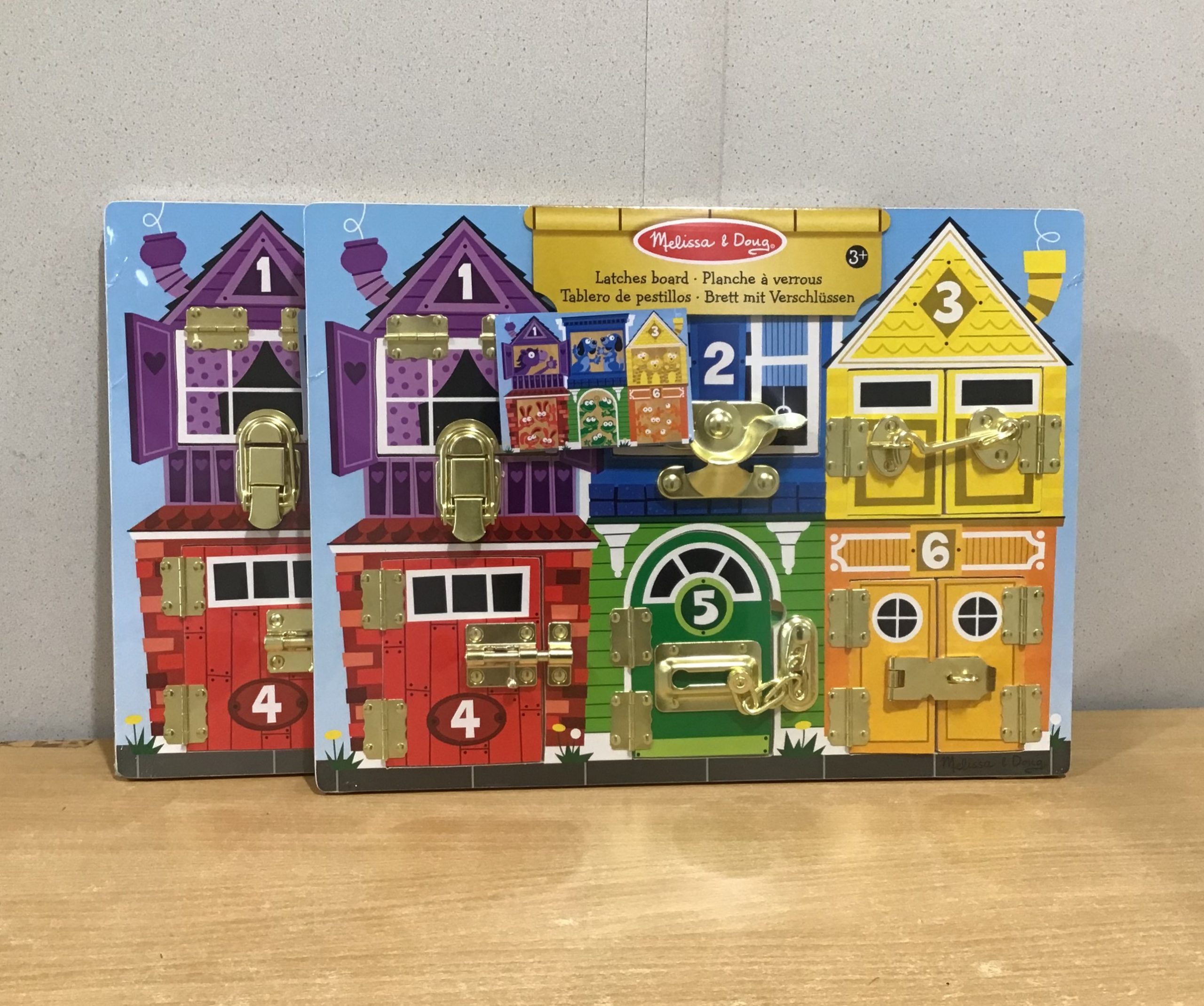 Latch manipulation develops fine motor and problem solving skills. The board can also be used for number, colour and animal recognition.